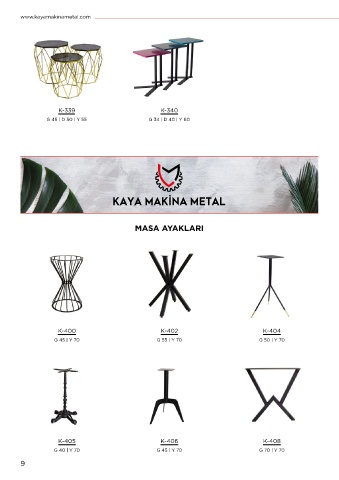 www.kayamakinametal.com K-339 K-340 G 45 | D 50 | Y 55 G 34 | D 40 | Y 60 MASA AYAKLARI K-400 K-402 K-404 G 45 | Y 70 G 55 | Y 70 G 50 | Y 70 K-405 K-406 K-408 G 40 | Y 70 G 45 | Y 70 G 70 | Y 70 9